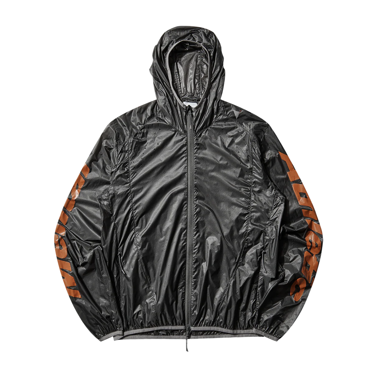 Mental Athletic x ROA Hue Packable Wind Jacket in black color. Extremely lightweight transparent micro ripstop nylon with lasered details. Close fit. Packable for easy use and storage. Centerline zipper opening and two front pockets. Finished with ROA and Mental Athletic logos print.